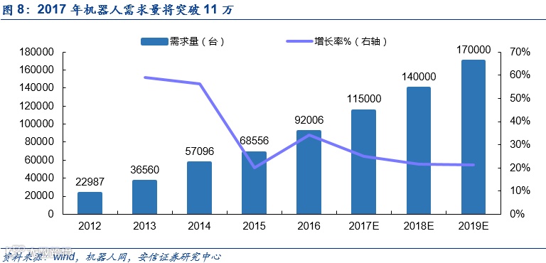 我国已经成为机器人最大的市场,我国工业机器人从2012年开始就保持迅猛的需求势头,连续四年蝉联销售量世界第一。中国机器人产业联盟数据显示2016年国产工业机器人销量29144台,同比增长16.8%,其中多关节机器人销量11756台。