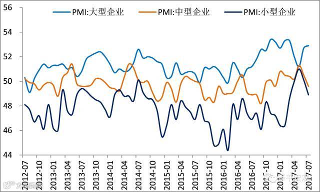 4)大企业扩张,中小企业收缩,验证新周期行业集中度提升强者恒强。6月大型企业PMI为52.9%,升0.2个点,景气度提升与建筑业扩张、黑色系补库价格反弹、供给侧改革推动有关;中型和小型企业PMI分别为49.6%和48.9%,回落0.9和1.2个点,均低于临界点。