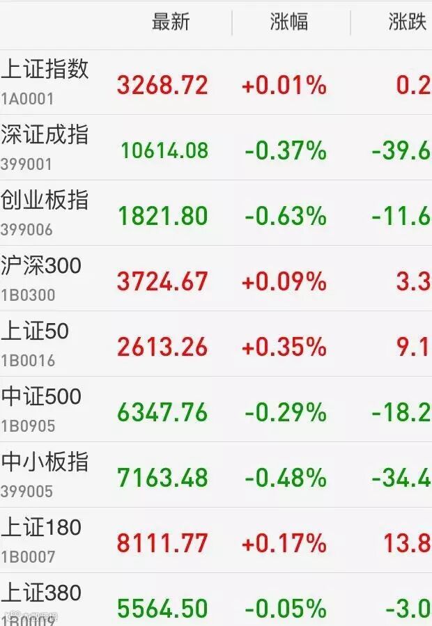 1、A股:上证综指收涨0.01%,报3268.72点;创业板最高触及1835点后回落,收跌0.63%,1836点压力位仍待突破;深成指跌0.37%报10614.08点。两市成交4799亿元,上日为5253亿。上周沪指涨1.88%创三个月最大周涨幅;深成指涨3.14%;创业板涨4.57%,创逾一年最大周涨幅。