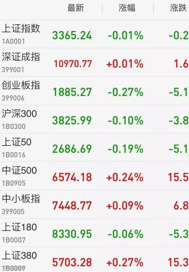 1、A股:上证综指收盘跌0.01%报3365.24点,深成指涨0.01%报10970.77点,创业板指跌0.27%报1885.27点。两市成交5532亿,周五成交6287亿元。上周,沪指跌0.06%,结束三周连涨;深成指涨0.83%,连涨4周;创业板指涨逾1%。