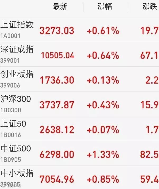 1、A股:上证综指收盘涨0.61%报3273.03点,录得四连涨并续创三个半月新高,月涨2.52%;深成指涨0.64%报10505.04点,月跌0.23%;创业板指涨0.13%报1736.3点,月跌4.5%。两市成交5405亿元,上日为4590亿。