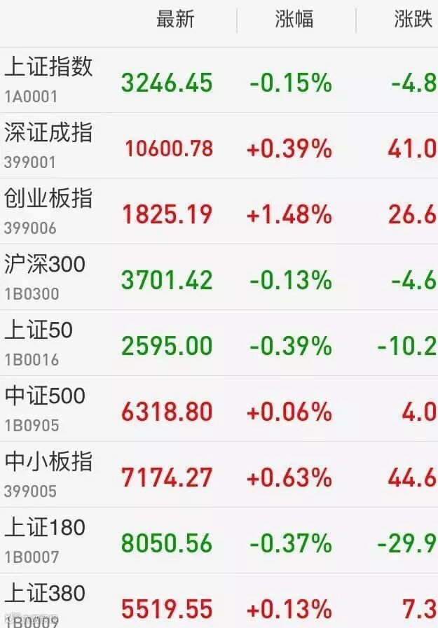 1、A股:上证综指弱势整理,收盘下跌0.15%报3246.45点;创业板指连续反弹,收盘涨1.48%报1825.19点,盘中一度升逾2%收复半年线,量能创4个月新高;深成指涨0.39%报10600.78点,创四个月新高。两市共成交4911亿元,上日为4552亿。