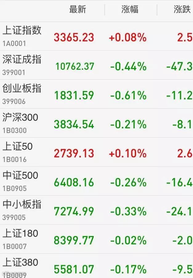 1、A股:上证综指收盘涨0.08%报3365.23点;深成指跌0.44%报10762.37点;创业板指下挫0.61%报1831.59点。两市成交5653亿元,上日为6400亿。次新股盘中飙升,一度逾40股涨停,尾盘上演惊天跳水,多股瞬间跌幅达10%。