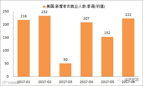 (2)非农新增就业超预期,失业率维持十年低位。6月美国新增非农就业人数22.2万,超出预期的17.8万,前值由13.8万上修至15.2万。也高于12月平均水平。失业率4.4%,比前值4.3%略有上升,但仍是十年来新低,好于2008年危机前的水平。劳动力参与率62.8%,比前值62.7%略有上升,基础呈现稳中向上的态势。