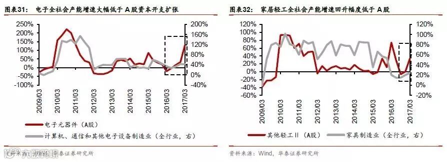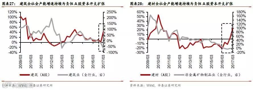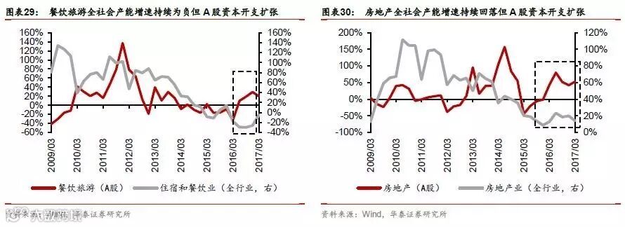 我们对比了统计局发布的分行业固定资产投资增速和A股的购建固定资产支出增速,其中有色金属、化学原料、化学制品、建筑、建材、餐饮旅游、房地产、电子、家居轻工、工程机械、化纤等行业均属于全社会产能增速下降或为负(或增速显著低于A股),而A股资本开支扩张的行业。