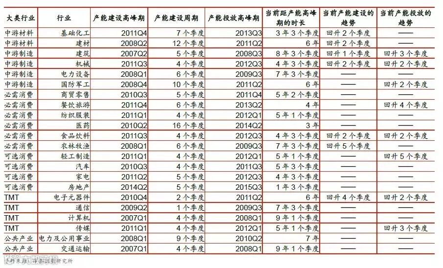我们用购建固定资产支出增速反映产能建设,固定资产净值增速反映产能建成投放,从资本支出到固定资产的增加,是产能形成的周期长度。下表为26个行业在过去10年中的产能建设高峰期、产能投放高峰期、产能形成周期长度,以及当前的产能建设趋势和产能投放趋势。