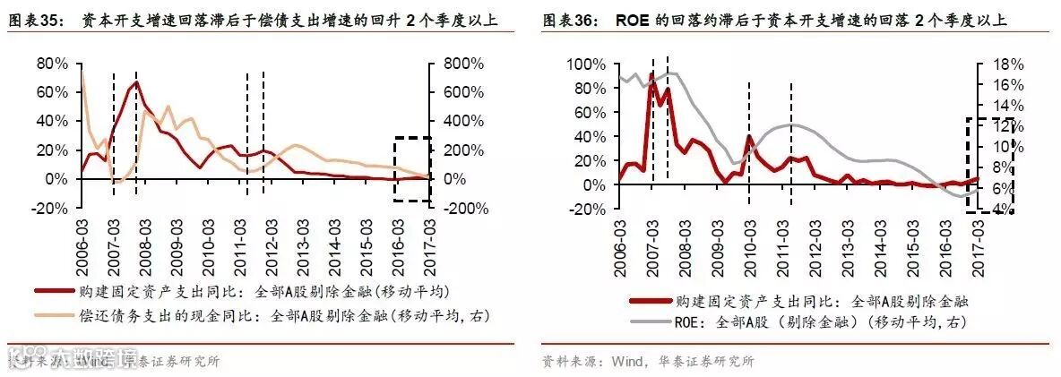 从历史财报数据来看,A股非金融企业的资本开支增速的回落滞后于偿债支出增速的回升约两个季度,而ROE的回落滞后于资本开支增速的回落约两个季度。由于2017年一季度A股非金融企业的偿债支出增速仍在回落,所以资本开支增速回升将至少延续至三季度,从而A股非金融企业的ROE将继续修复至少4个季度,高点或在在明年一季度后出现。