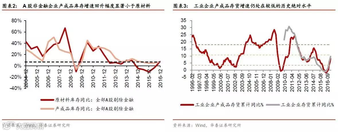 第二、 原材料库存水平回升幅度较大,而产成品库存水平仅小幅回升,一定程度上反映企业主动进补原材料,而产成品库存去化速度较快:2016年底的产成品库存增速与2013年补库周期启动时相当,相比2016年初补库周期启动时,仅小幅回升了2.46%。