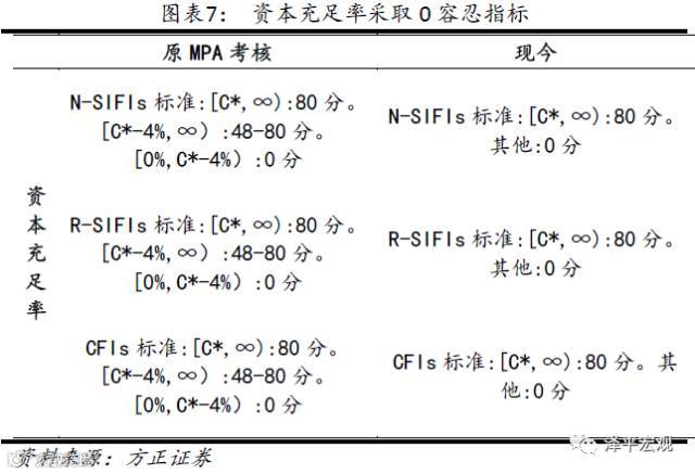 资本充足率被认为是MPA考核中最关键的指标。从国际经验来看,巴塞尔协议I、II、III均对资本充足率进行重点要求,各国金融监管当局使用这一指标来监测银行抵御风险的能力,目的在于抑制风险资产的过度膨胀,保护存款人和其他债权人的利益、保证银行等金融机构正常运营和发展。年后MPA考核中,资本充足率取消容忍度指标,对于未达标的银行将得0分。MPA考核此前自2016年推出以来,不可能一步到位,给予被考核机构一定的能动空间,特别是规模较小、风险较高的地方及区域性商业银行,在MPA考核推出一段时间后,根据现实经济情况调整评价考核体系,明确考核的重点和限制,进一步加强对被监管机构的有效监管,谨防银行等为通过MPA考核进行短期调整,旨在长期引导、规范银行的市场行为。