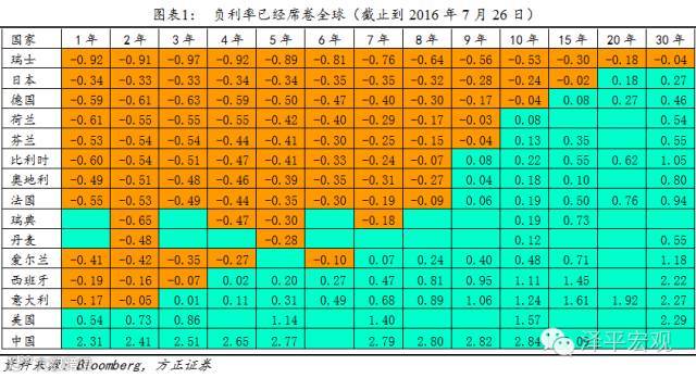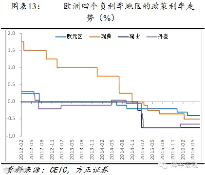 截止到2016年6月,五个央行实施的负利率水平分别是:日本-0.1%、欧洲-0.4%、瑞典-0.5%、丹麦-0.65%、瑞士-0.75%。