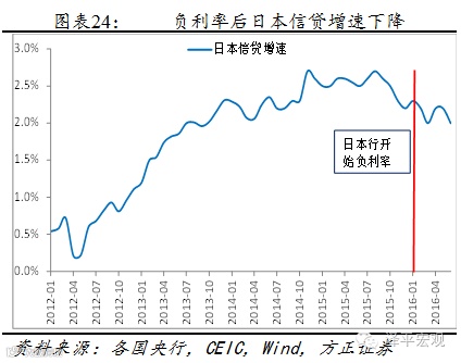 瑞士私人部分的贷款增速在负利率后下降,2014年12月负利率实施前贷款增速为2.7%,2015年12月一度降为0.6%,当前(2016年5月)为1.7%。2016年1月,日本的贷款增速为2.3%,实施负利率后,日本的贷款增速放缓,2016年6月增速为2%,较1月下降0.3个百分点。