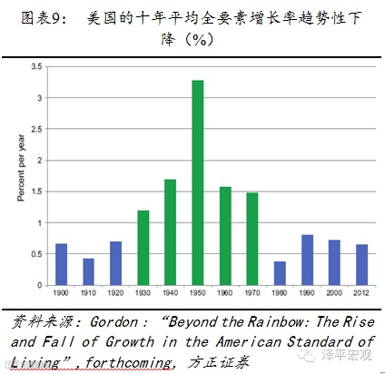 从供给端来讲,美日欧老龄化,教育边际产出变小,技术进步速度可能已变缓。美日欧的老龄化趋势,减少了劳动力供给带来了更多的储蓄,给实际利率的下行也带来了压力。教育的普及带来的生产效率提升趋弱,主要发达经济体的教育普及已到一定程度,再想突破难度提升,边际效应小。近年来技术创新的速度变慢,信息革命和计算机普及带来的影响局限于金融业等少数行业,远不可与两次工业革命的影响相比,全要素生产率的增长放缓。