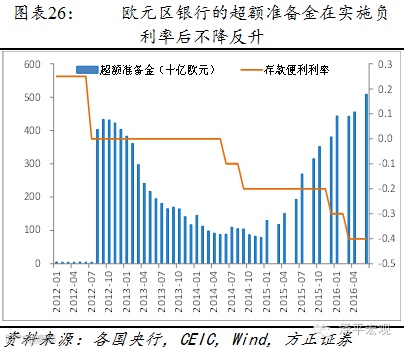 欧元区商业银行增加超额准备金的行为,与负利率实施后超准备金下降的传导机制预计相左,也证明不可将欧元区信贷增速的提高看作是负利率的功劳。2014年6月至2016年6月,商业银行存储在欧洲央行的超额准备金上涨了476%,这显示欧元区银行还是准备储备超额资金而不是积极的借出去。