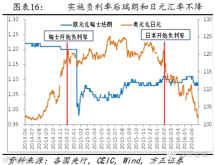 在防止本币升值方面,负利率的实施仅在丹麦实现了目标,瑞士法朗和日元则明显升值。