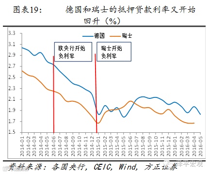 在欧元区,实施负利率后,德国的抵押贷款利率在下行过一段时间后,又开始回升。在瑞士,负利率一开始实际上提高了抵押贷款利率。