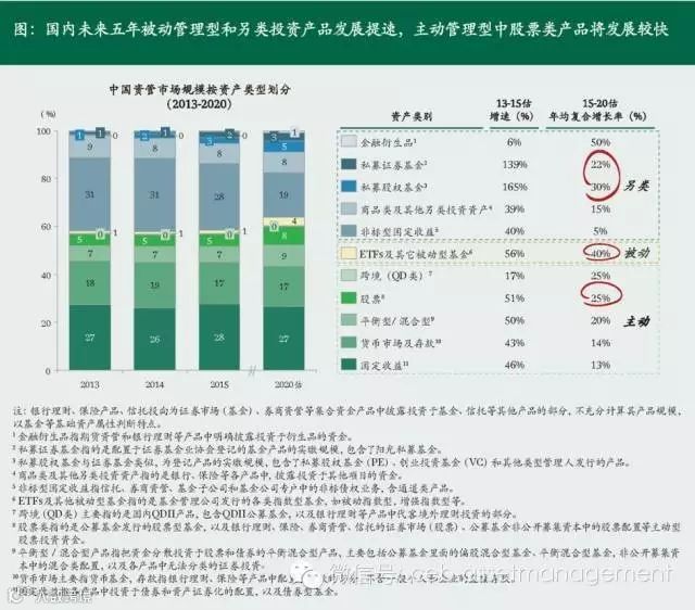 从资产类别看:“资产荒”成为2015年至今最突出的挑战。资管行业在资产端缺乏相对高收益、低风险的优质基础资产,倒逼资管机构降低产品收益。同时,为了抵御市场份额流失的压力,领先资管机构需要主动拓展资产类别和策略,加大产品创新,夯实行业研究和风险管理的基础,主动应对挑战。结合经济调整期“资产荒”现象的延续以及直接融资快速发展的宏观背景,未来五年,被动管理型和除非标固收外的另类投资产品整体上发展较快,比如指数型基金、私募证券基金、私募股权基金;而主动管理型中,股票类产品发展较快,跨境类产品也有较大潜力。