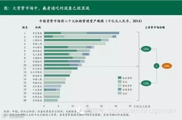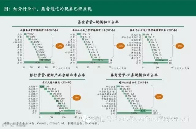 中国资管市场中,“赢者通吃”的现象也已经显现。前十大资管机构管理资产规模市场份额总计32%,前20大资管机构市场份额总计44%,集中度与全球资管市场相近。在细分行业中,“赢者通吃”的现象更加明显。例如,根据2014年底数据,中国前十大银行理财产品余额合计市场份额占比68%;2015年底,前十大公募基金规模合计占比达57%,前十大基金公司专户规模合计占比达49%,前十大基金子公司专户规模合计占比达48%,前十大券商资管规模合计占比50%。