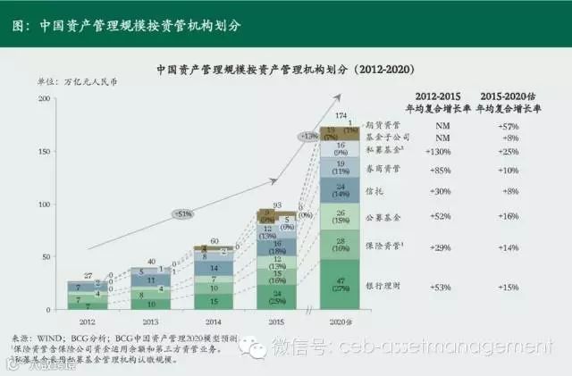 从资管机构来看,至2020年,我国资管市场中银行仍为中坚力量,占管理资产规模总额的27%,2015-2020年均复合增长率达到15%;保险资管也将继续占据重要的市场地位, 占管理资产规模总额的16%;公募基金和私募基金增速最快,2020年管理资产规模占比分别为15%和9%,2015-2020年均复合增长率分别达到16%和25%;信托公司、基金子公司和 券商资管等比较依赖通道类业务的机构则面临转型,2015-2020年均复合增长率将分别放缓至8-10%。但信托公司由于发展时间长、基础体量大、转型早,2020年仍为第四大资管机构,管理资产规模占比14%。