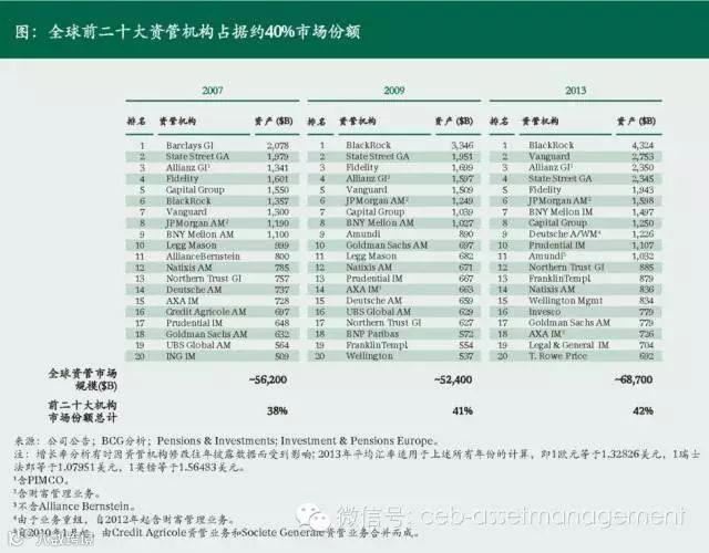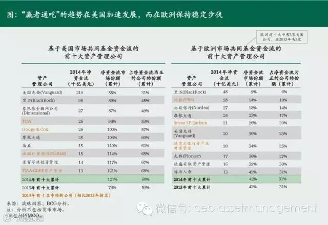 除不同子行业发展快慢不均外,我们从全球市场还观察到一个通行的趋势——资产管理市场“赢者通吃”现象明显。全球资产管理业务的发展经验指出资产管理是一项需要规模效应的业务,成功机构往往在某些特定领域建立规模效应。全球前20大资产管理机构管理资产规模市场份额合计2007年为38%,2009年为41%,2013年为42%,20家机构即占据全球市场近一半。如果看增量,则这一趋势更加明显。例如,美国前十大共同基金管理规模2014年的增量达到了美国共同基金市场整体增量的121%(除前十大机构以外的其他机构增量合计为负数),而这一数字在2013年只有73%,也就是说前十大机构对市场增量的贡献大大提高。在欧洲,这一趋势则趋于稳定,同样是前十大共同基金管理规模2014年增量占市场总体的比重,欧洲2014年和2013年的比重均为42%。