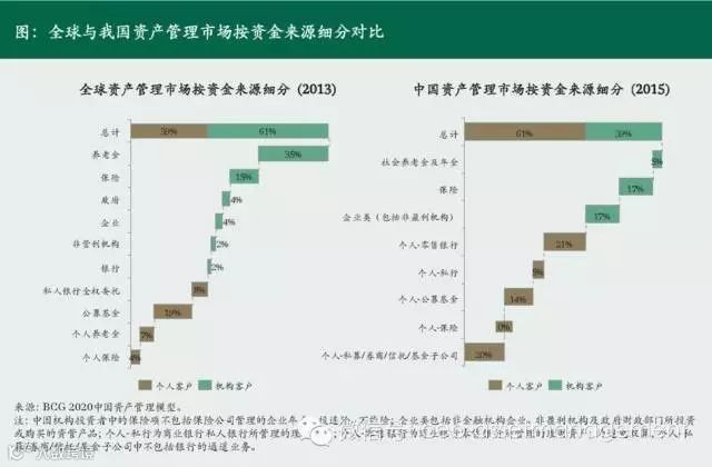 从资金来源看:相较于全球市场,我国最显著的特征是机构资金占比较低,仅40%左右,其中养老金占比远低于海外。未来几年,随着养老金入市、养老第二第三支柱快速发 展,养老金在资管市场中的重要性有望大幅提升。此外,险资及企业也仍是重要的机构投 资者。个人投资者中,一方面高净值客户仍是中坚力量,其投资行为的成熟和需求的复杂 化对资管机构提出了新的要求;另一方面,中产、数字大众等客群兴起,资管机构可以凭 借互联网金融以较低的成本服务此类客户。