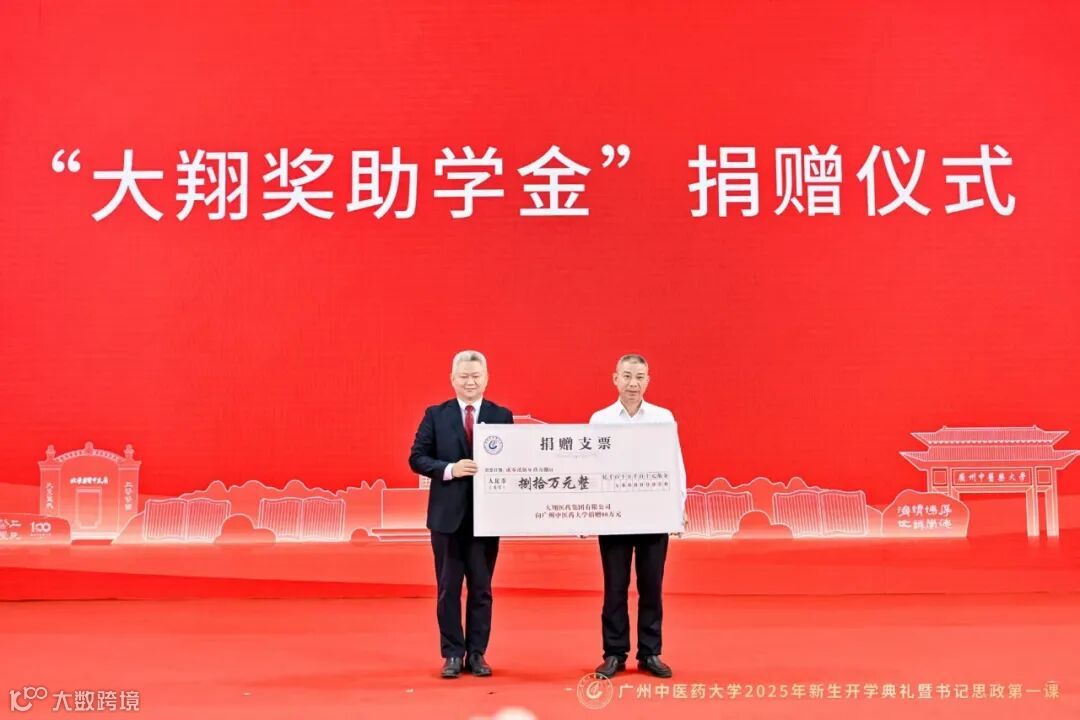 2025年9月8日,广州中医药大学2025年新生开学典礼在大学城校区顺利举行。大翔集团董事长陈东平作为特邀嘉宾出席典礼,并代表大翔集团向学校捐赠80万元,设立“大翔奖助学金”,用于鼓励优秀学子、资助学生完成学业。这一举措不仅体现大翔集团深厚的企业社会责任感,更展现了陈东平董事长推动中医药人才培育与行业发展的坚定决心。