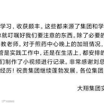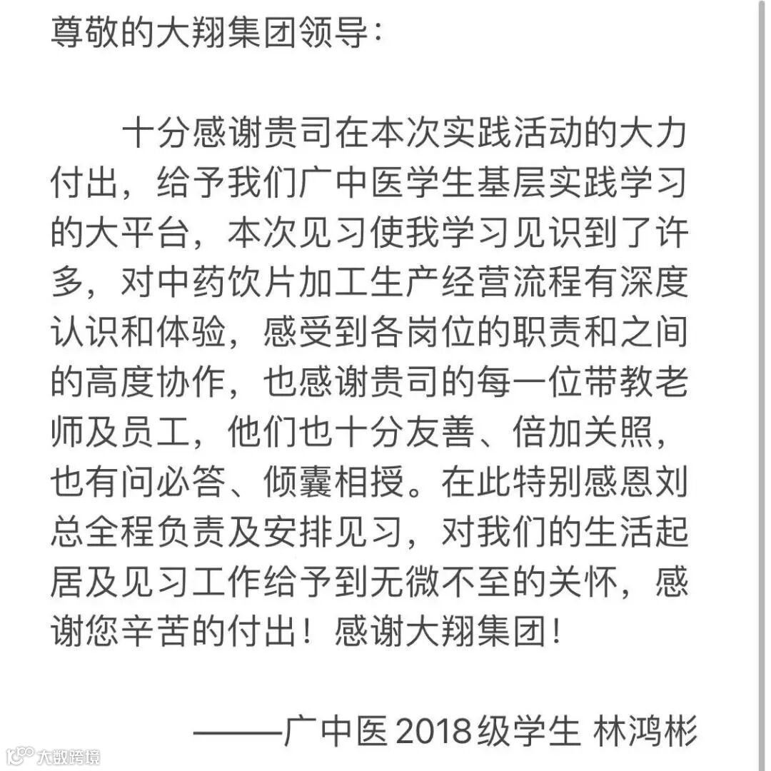 见习生们表示,在大翔集团见习、生活期间,使他们学到了很多学校里没有的新知识,更加坚定了从事中医药学的信念。未来,他们将不负青春、不负韶华,不负师长和家人,努力学习,争取成为一名中医药领域的有用之才。
