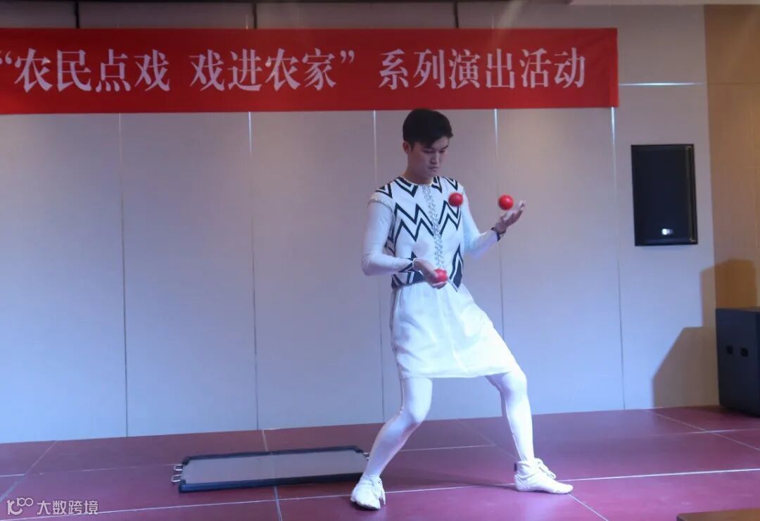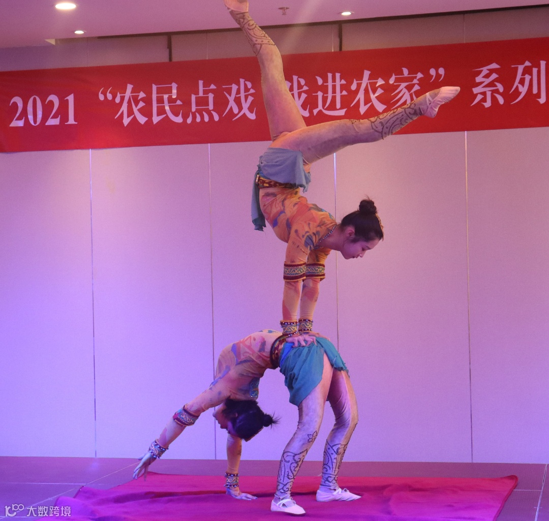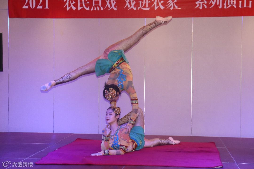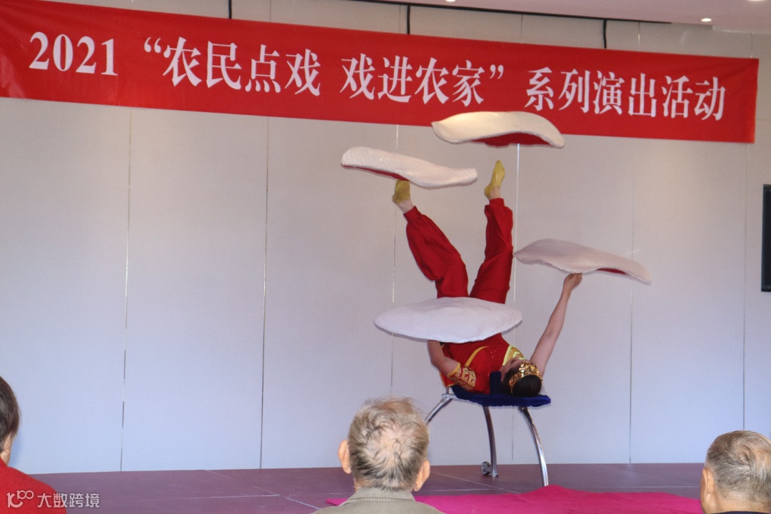天津杂技团正在为颐安的长者们举行着杂技表演,身着彩衣的演员们在舞台上展示着绝技,转毯、魔术、双人柔术、相声魔术…… 其中“头顶花坛”的表演中,杂技演员把花坛顶在头顶舞了起来,让花坛与自己融为一体。长者们看到如此奇趣的场景,不禁拍案称奇。