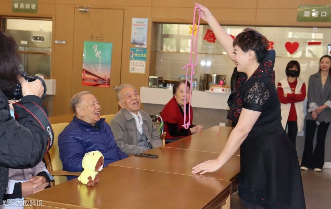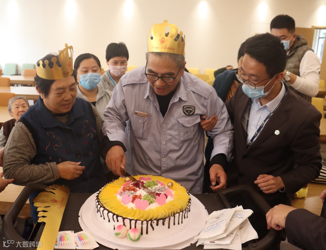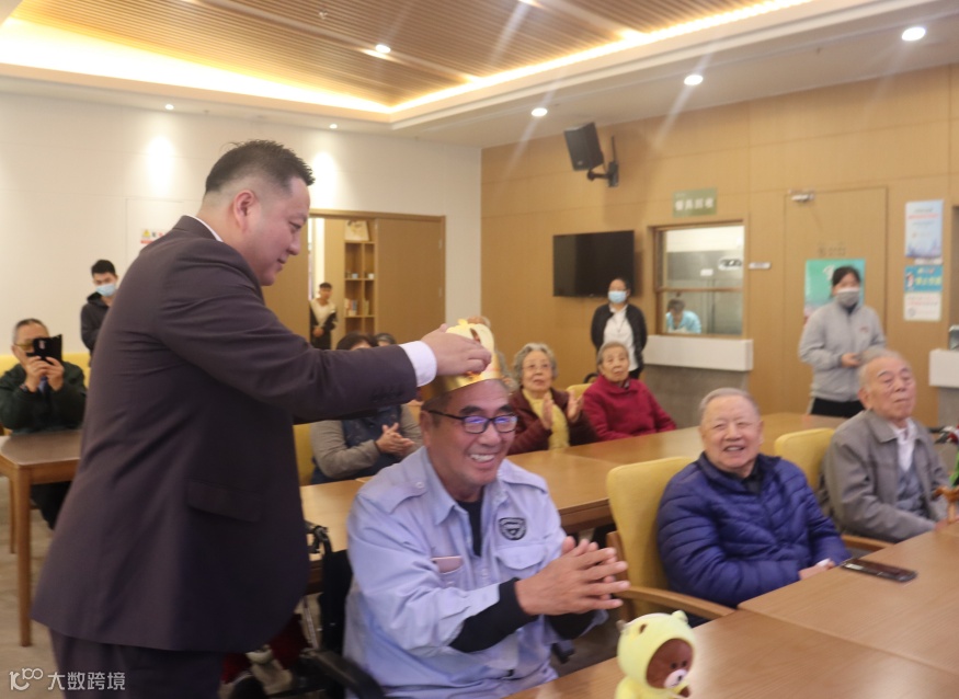 演出结束后院长为过寿的长者佩戴生日帽,祥和的氛围中,工作人员们为长者合唱生日快乐歌,现场一片欢声笑语。