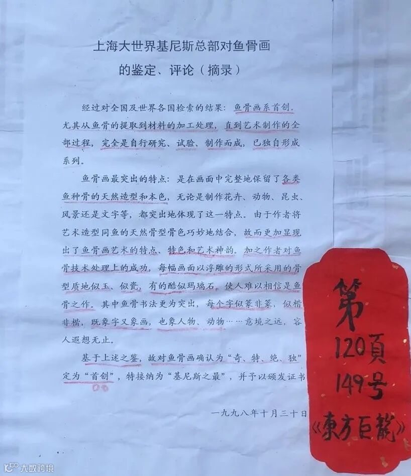 后来听从文艺工作者的建议,在1998年9月,赵爷爷带着作品到上海参加吉尼斯世界纪录的评审。吉尼斯总部的领导表示,全国各地甚至世界各地从来也没有听过或见过,居然采用鱼骨头摆出画来,这是需要对生活、对艺术很高的理解,才能创造出来的杰作,于是当场同意授予赵爷爷大上海吉尼斯之最《全国首创鱼骨画》,载入史册。