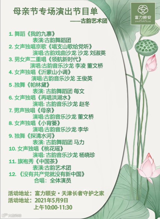 富力颐安·天津长者照护之家为了庆祝母亲节,特邀古韵艺术团前来演出。不仅是为了弘扬中华民族传统文化,更是为了丰富妈妈们的文化生活,同时让妈妈们度过一个欢乐难忘的母亲节。快带上妈妈一起来观看精彩表演吧~