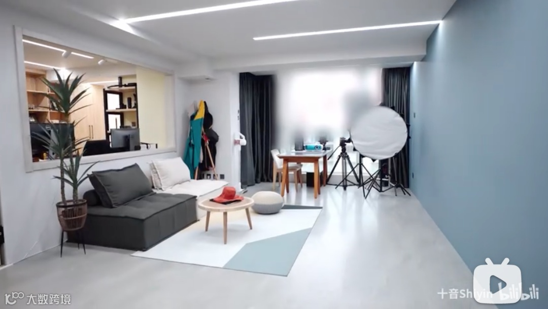改造亮点:作为在家的职业穿搭up主,十音对新家的改造处处为工作考虑,因为家就是重要的办公场所和随时开拍的影棚。书房与客厅的墙被开了一个巨大的窗,用来增加拍摄时的景深效果,虽然客厅面积并不小,但为了存放三角架反光板等大型拍摄工具,摒弃了宽体式的沙发,同时电视墙也被没有装饰的纯色墙面所替代,可以随时充当影棚背景。同样出于工作需要,客房被打造成了巨型衣帽间,而卧室一侧的浴缸,则是十音的少女夙愿。