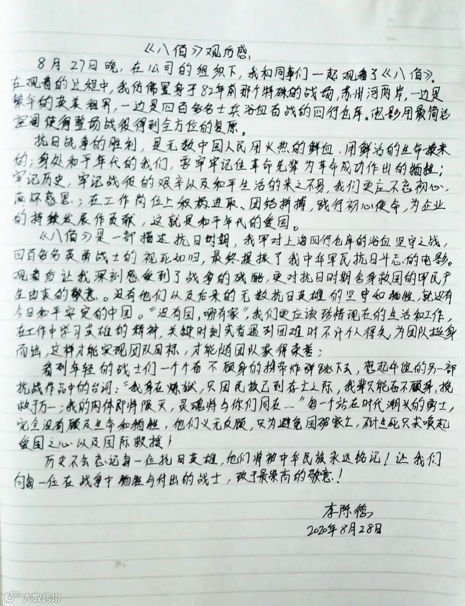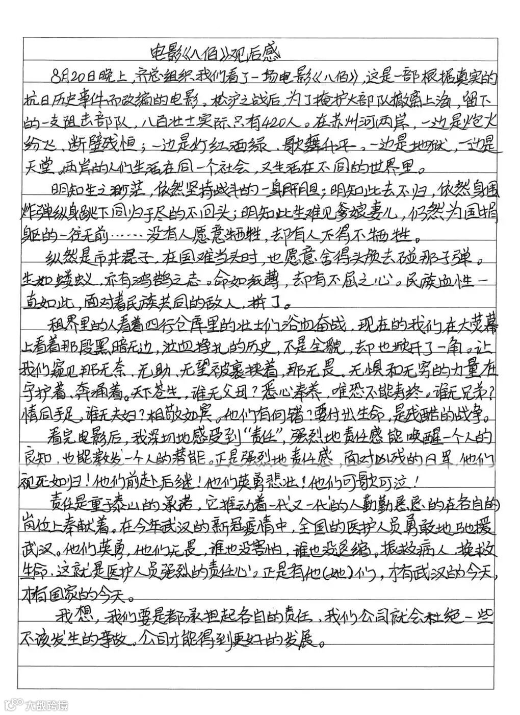 我司于2020年8月27日,组织员工观看爱国主义题材影片《八佰》。在中国人民抗日战争胜利75周年到来之际,追忆民族先烈英勇抗击外来侵略的悲壮历史。