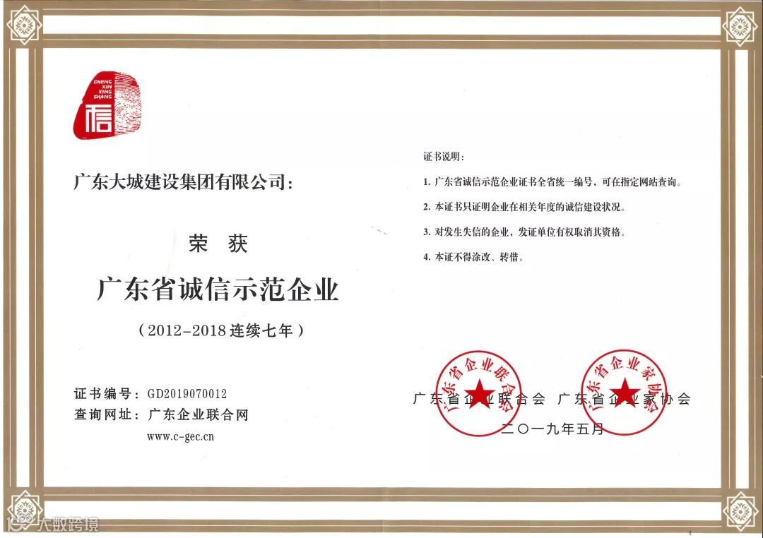 我司在2012年-2018年连续七年获得“广东省诚信示范企业”荣誉,这是广东省企业两会对我司的肯定和信任,我司将一如既往地牢记新时代赋予企业家的使命,发扬不忘初心、勇于担当精神,积极履行社会责任,不断加强自我提升。