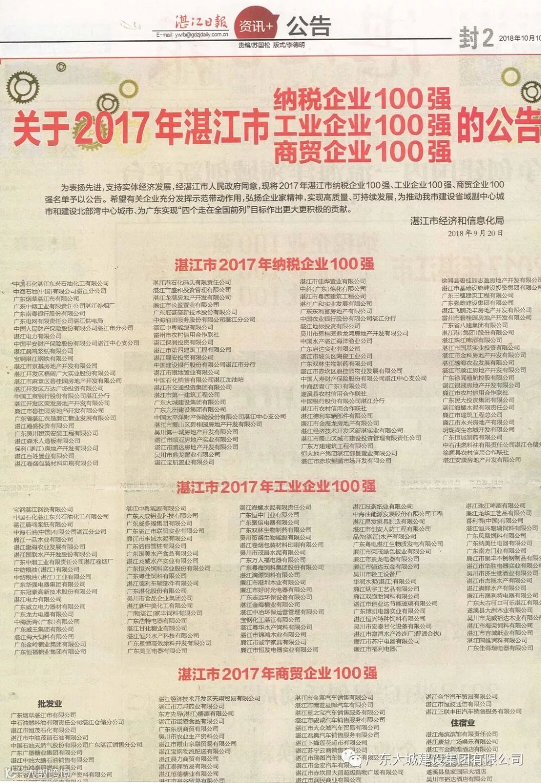 近日,我司继去年获得2016年湛江市纳税百强企业,今年再次获得这一殊荣,被湛江市人民政府评为2017年湛江市纳税百强企业,并在全市进行通报表彰,表彰了我司为了湛江市经济发展、特别是税收收入持续稳定增长做出巨大贡献,这也是我司连续第2年入榜。