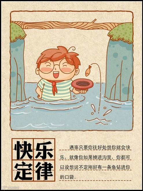 2、快乐定律:遇事只要你往好处想你就会快乐,就像你如果掉进沟里,你都可以设想说不定刚好有一条鱼钻进你的口袋。