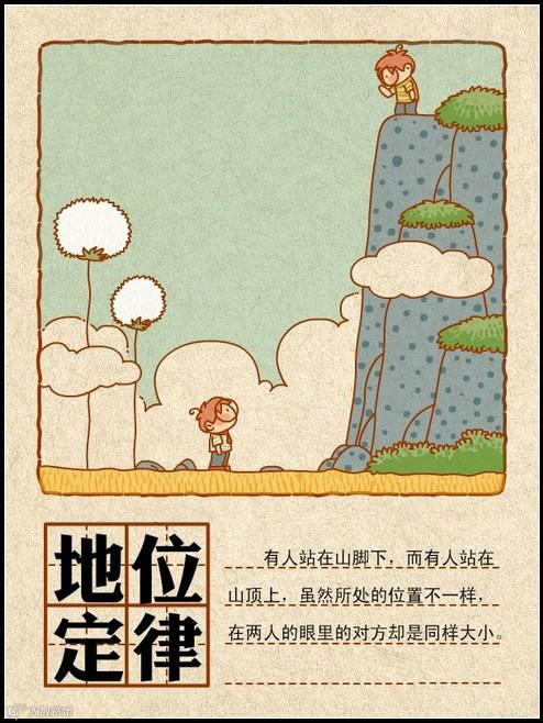4、地位定律:有人站在山脚下,而有人站在山顶上,虽然所处的位置不一样,在两人的眼里的对方却是同样大小。