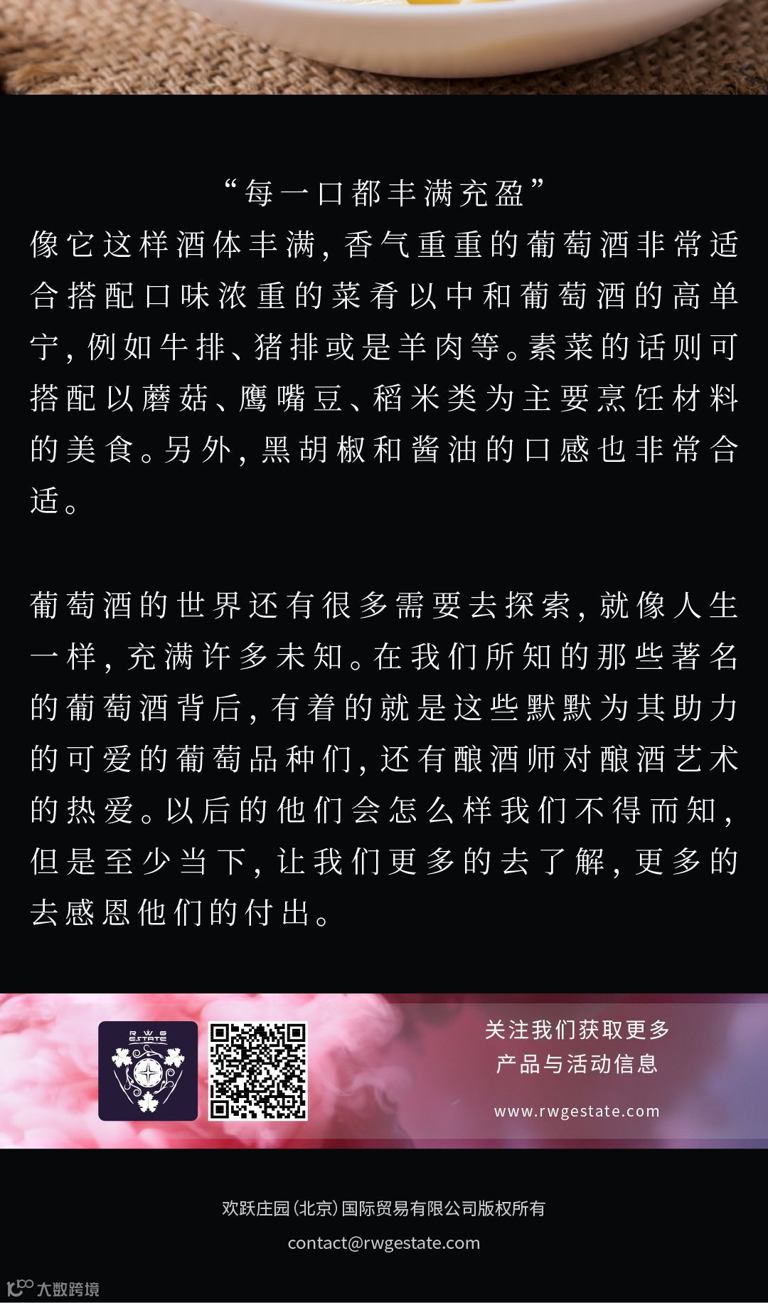 RWG Estate欢跃庄园,由两家位于墨尔本的公司联合建立。在澳大利亚多个知名葡萄酒产地,生产研发即富典型澳洲风味又别具创新的现代葡萄酒产品。欢跃庄园的美酒按照澳大利亚葡萄酒管理局的严格要求在当地生产并灌装,只为带给您更真切的澳洲体验。