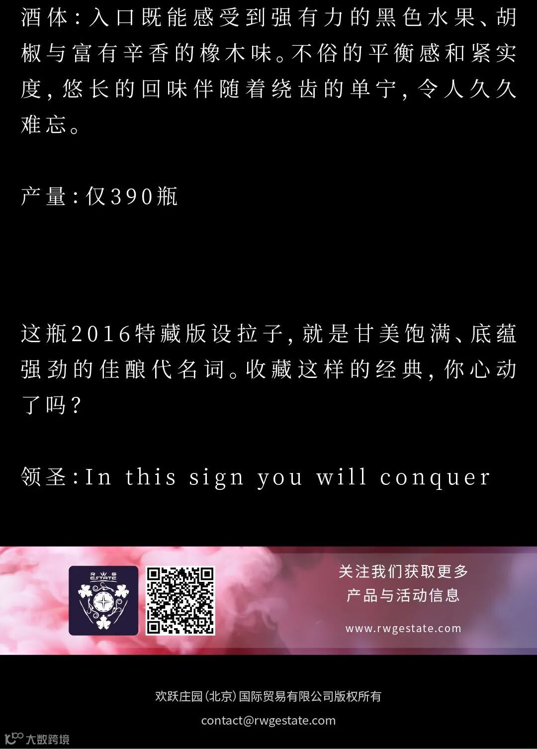 RWG Estate欢跃庄园,由两家位于墨尔本的公司联合建立。在澳大利亚多个知名葡萄酒产地,生产研发即富典型澳洲风味又别具创新的现代葡萄酒产品。欢跃庄园的美酒按照澳大利亚葡萄酒管理局的严格要求在当地生产并灌装,只为带给您更真切的澳洲体验。