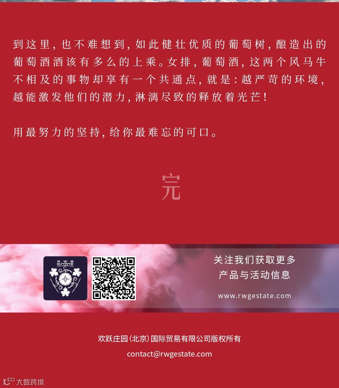 RWG Estate欢跃庄园,由两家位于墨尔本的公司联合建立。在澳大利亚多个知名葡萄酒产地,生产研发即富典型澳洲风味又别具创新的现代葡萄酒产品。欢跃庄园的美酒按照澳大利亚葡萄酒管理局的严格要求在当地生产并灌装,只为带给您更真切的澳洲体验。