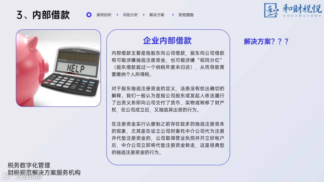 内部借款主要是指股东向公司借款,股东向公司借款有可能涉嫌抽逃注册资金,也可能涉嫌“视同分红”(股东借款超过一个纳税年度未归还),从而导致需要缴纳个人所得税。对于股东抽逃注册资金的定义,法条没有给出确切的解释。我们一般认为是指公司股东或发起人依法履行了出资义务即向公司交付了货币、实物或转移了财产权,在公司成立后,又抽逃其出资的行为。