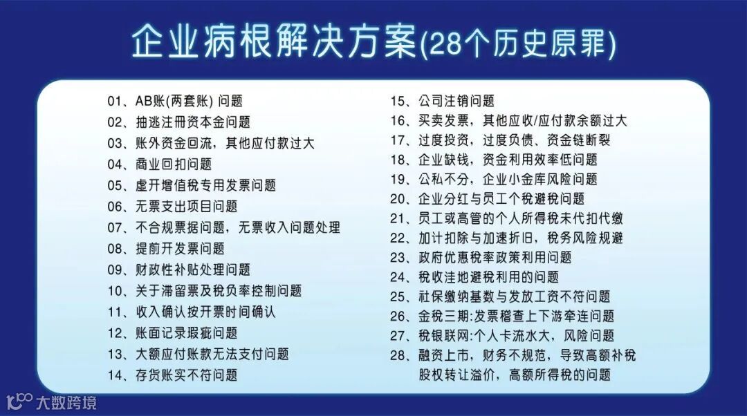 代账行业大部分财税机构都是经验主义者,靠的是以前的经验,但是国家政策日新月异,财税机构还没反应过来就过时了,因此我们和一集团和国内著名的税务运营商合作,首创国内屈手可指的5大体检报告,目的是把标准定义为合法的监控范围之内。