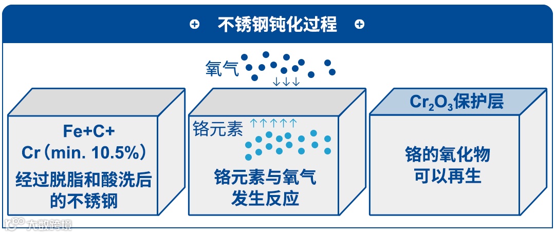 钢材中铬含量大于10.5%时,铬易与空气中的氧结合,在钢材表面形成薄薄的、透明的氧化铬(Cr2O3)保护层,它可以隔绝外部环境对基材的侵蚀,遏止氧化铁的生成,因此不锈钢比一般钢材具有更佳的抗腐蚀性和耐热性,也能在大气中较久地保持金属光泽。此外,薄膜即使被外力损伤,仍能很快地再次形成新的保护膜,这就是不锈钢形成的原因。