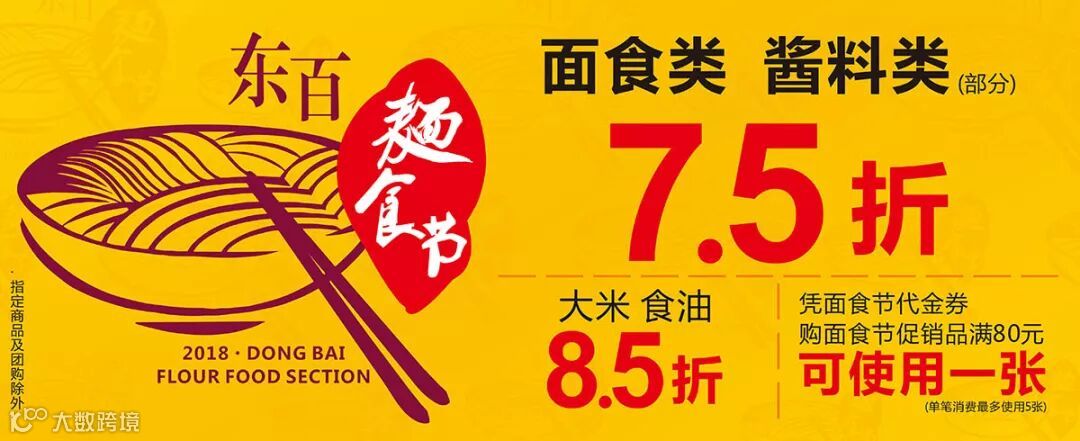 凭面食节代金券购面食、粮油促销商品满80元可使用一张代金券(明示商品除外)(单笔消费最多限用5张)。