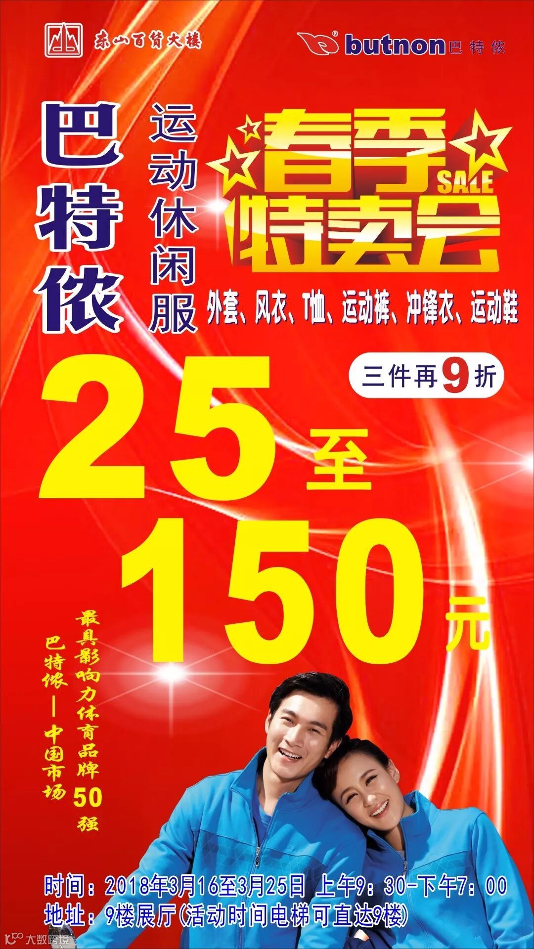 东山店9楼【巴特侬运动休闲服特卖会】全场25~150元,购三件再9折
