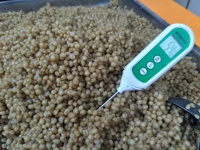 5、摊凉:取出小麦摊开,让它散热,达到正常温度(30度以下)。蒸麦子的水可以趁热用来烫一下容器,选用玻璃或不锈钢的最佳。再准备一把勺子,也烫一下,去除杂菌。