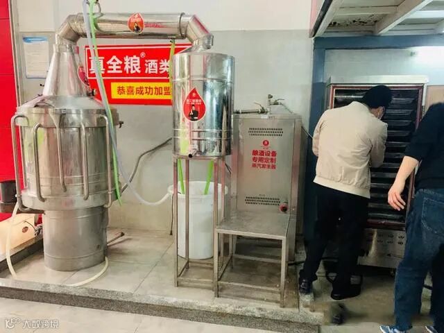 9、蒸馏:酒醅发酵好,用酒度计测量,度数在8-10度就可以蒸馏了,蒸馏出的即是小麦白酒(接到自己想要的度数即可)。