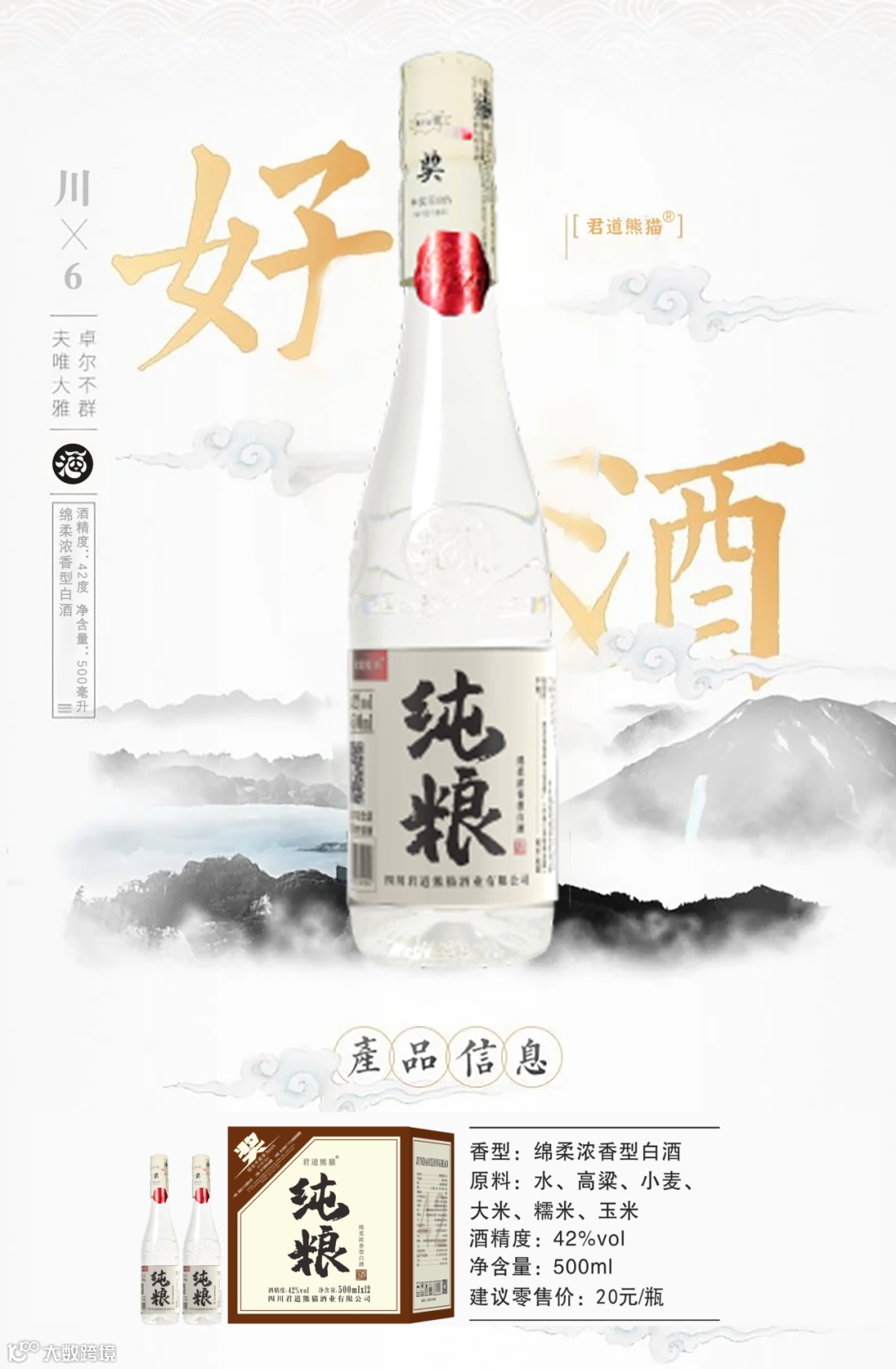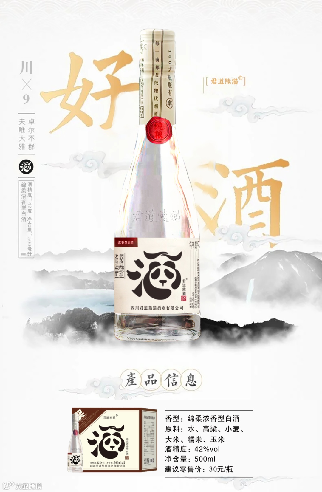 提到熊猫,没人会陌生。这种自带国民好感的动物,是中国文化最温柔的使者。君道熊猫酒把熊猫元素融入包装:瓶身上憨态可掬的熊猫剪影,一下子拉近了与消费者的距离。