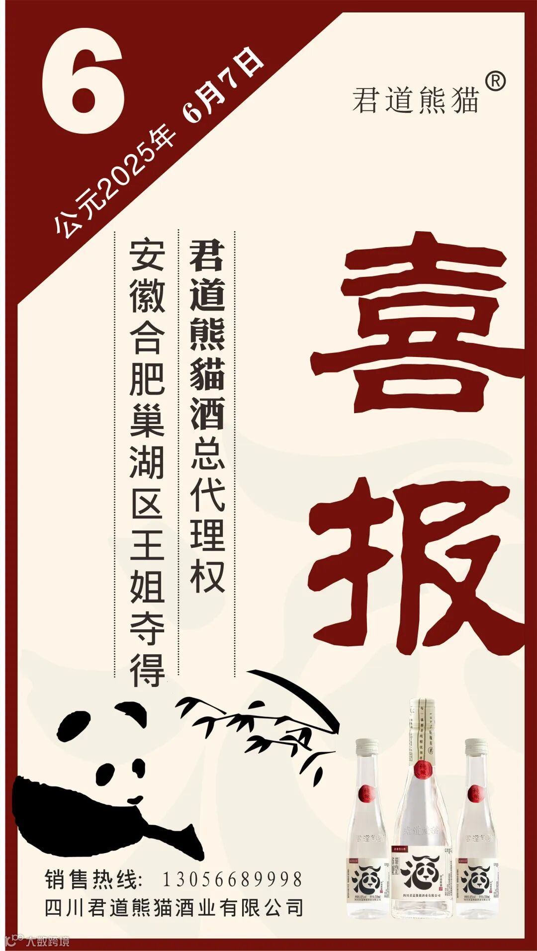 热烈祝贺安徽合肥巢湖区王姐、安徽马鞍山当涂县王总成功夺得君道熊猫酒总代理权!