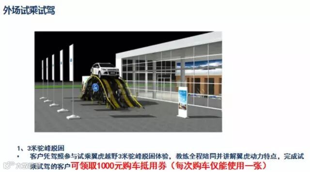 活动当天,成功挑战翼虎3米驼峰脱困的客户即可获得1000元购车体验券(全程由专业教练陪同讲解);