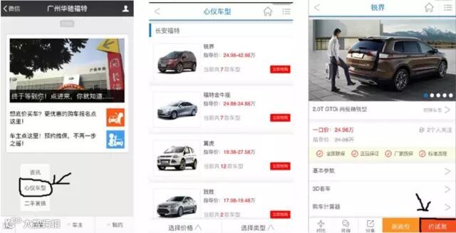 (1)“心仪车型”选项 (2)点击一款心仪车型 (3)点击右下角预约试驾